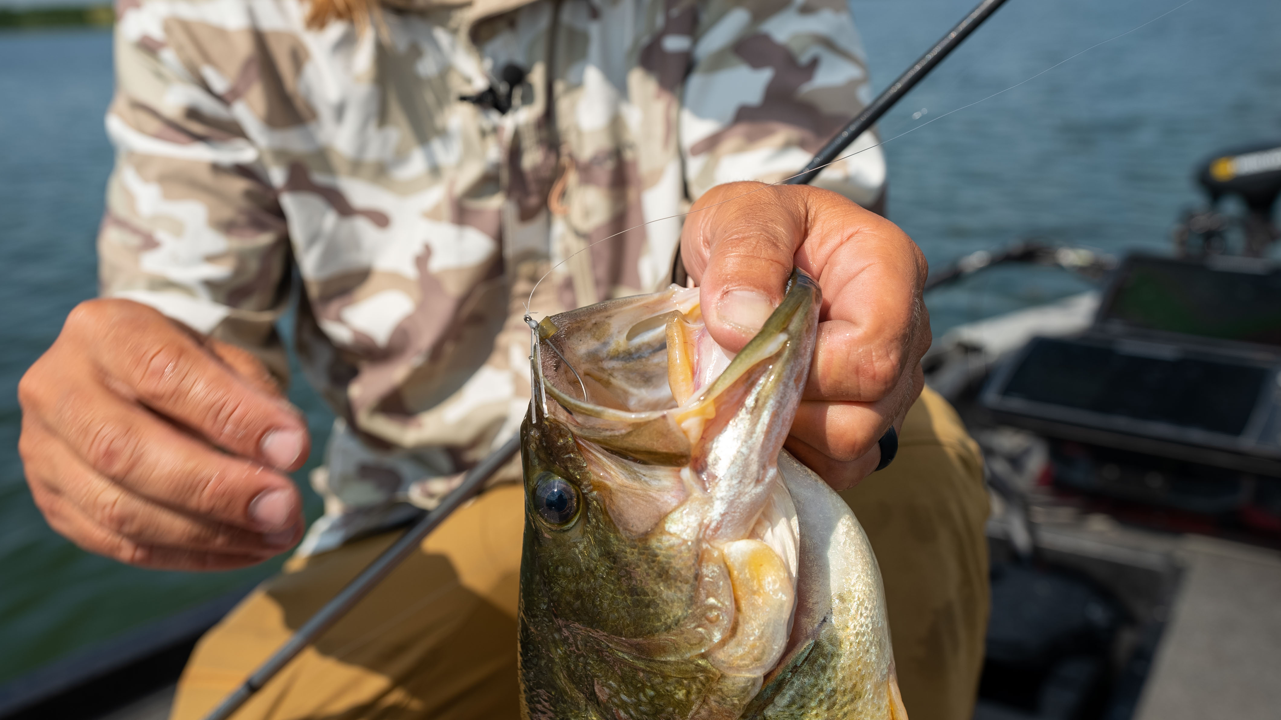 When fishing around softer cover like grass, Feider opts to still use the regular version because he can rip the hook free as he works the bait back to the boat.