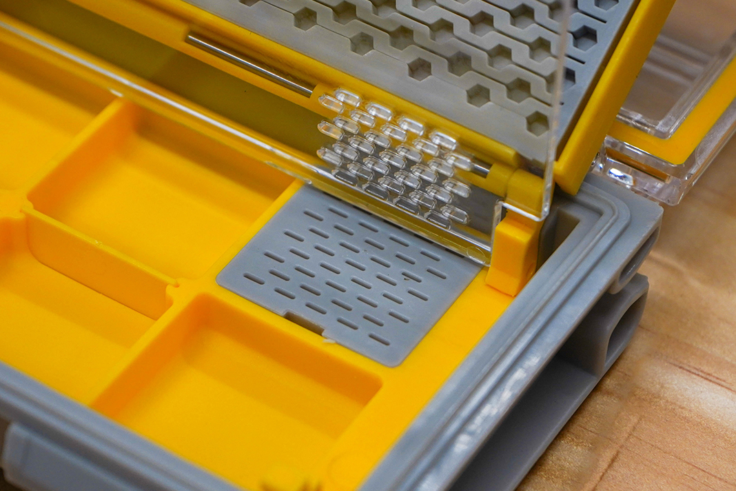 There are two main concerns when it comes to protecting your ice tackle investment. The first being rust, which is the quickest way to ruin your entire box of jigs. It’s difficult to keep ice and slush from entering your gear but the EDGE Micro Jig and Micro Fly boxes come equipped with a Dri-Loc O-ring seal to help keep unwanted moisture out.