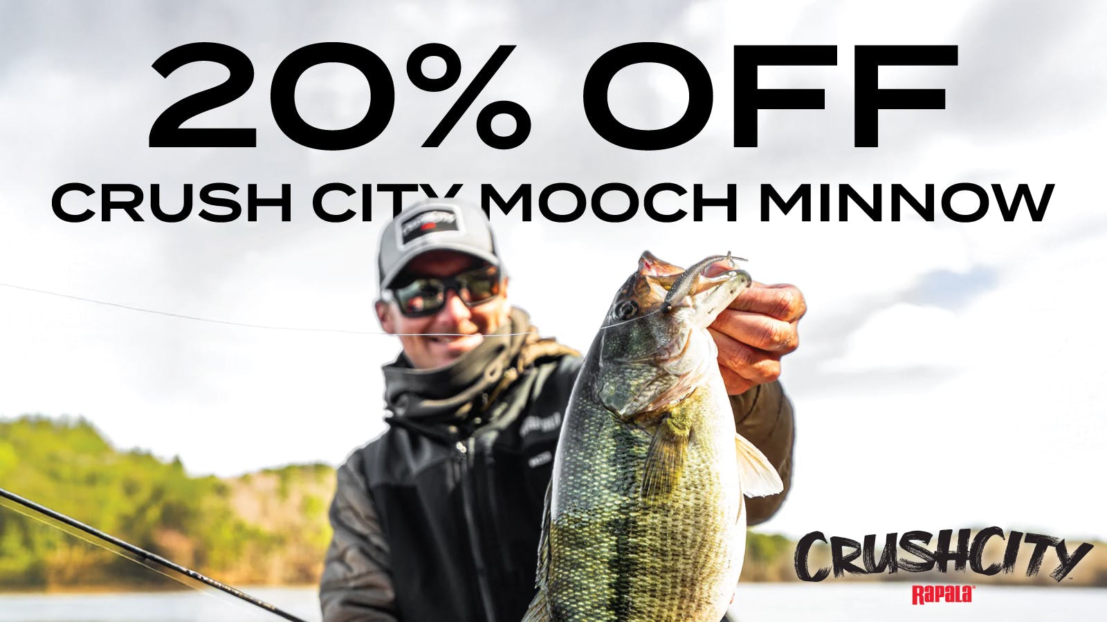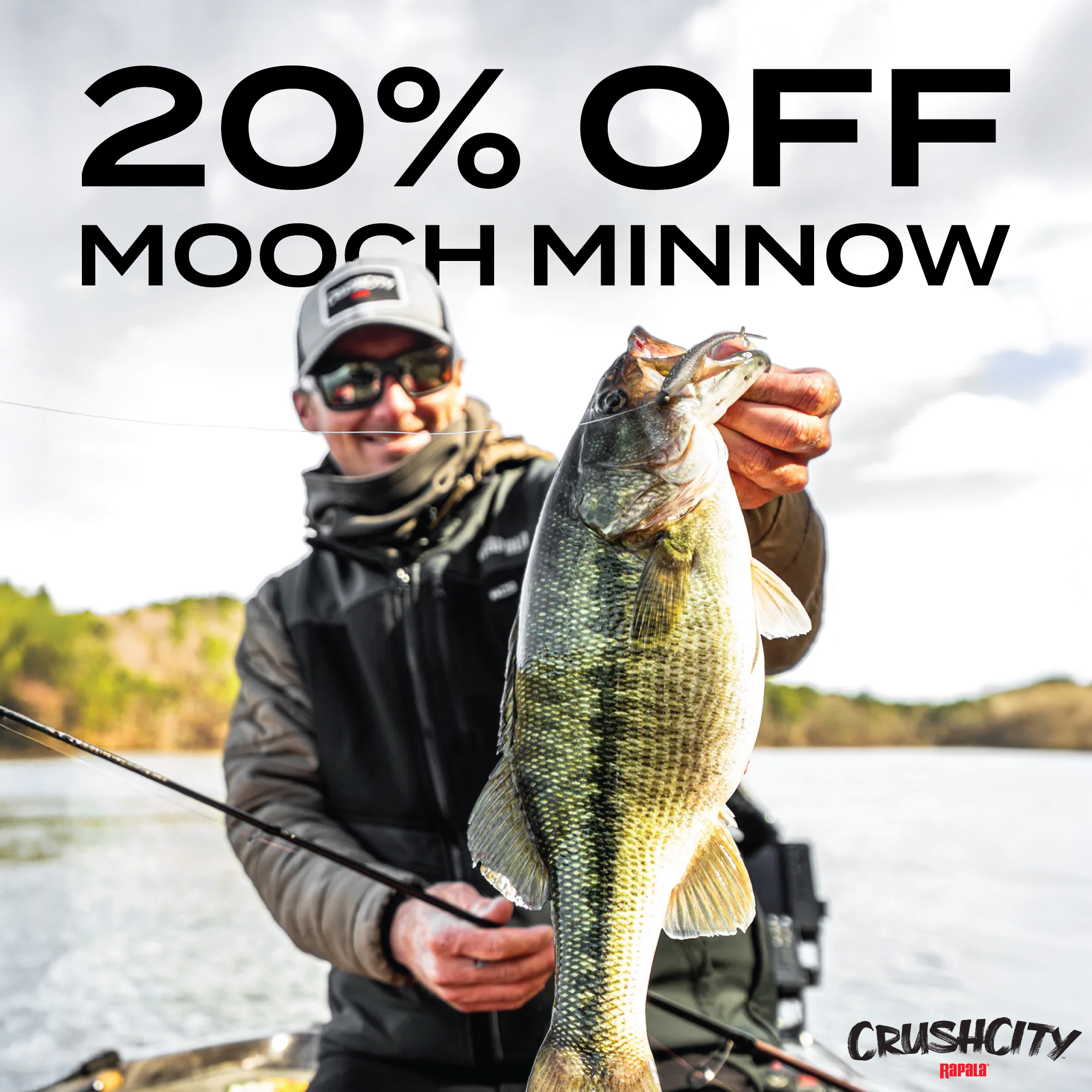 The Crush City Mooch Minnow’s floating body and unique tab tail deliver subtle, natural action that drives bass wild—durable, versatile, and built to catch more fish. For a limited time, get 20% off Rapala Crush City Mooch Minnow.