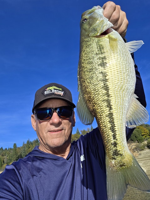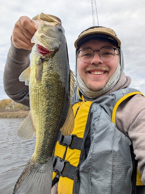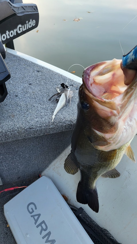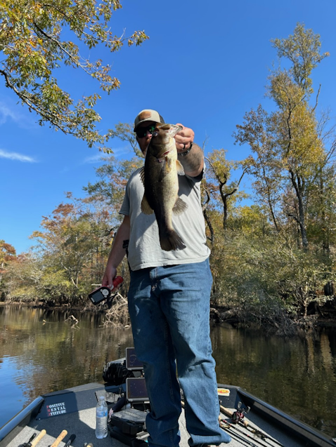 Healthy 16 inch bass caught in less than 5 feet of water on a Carolina rig around submerged vegetation and stumps.