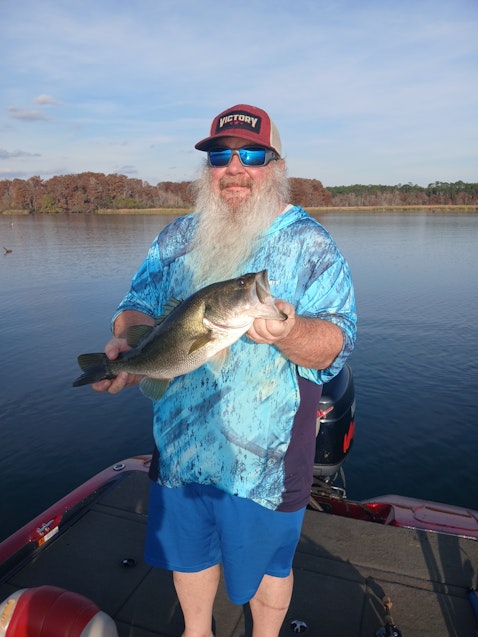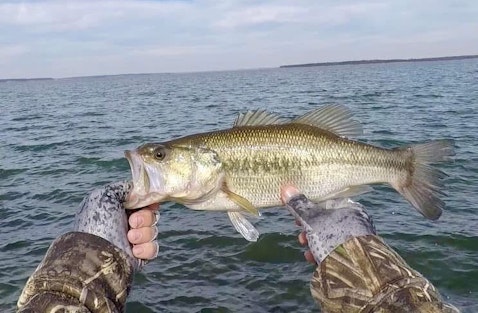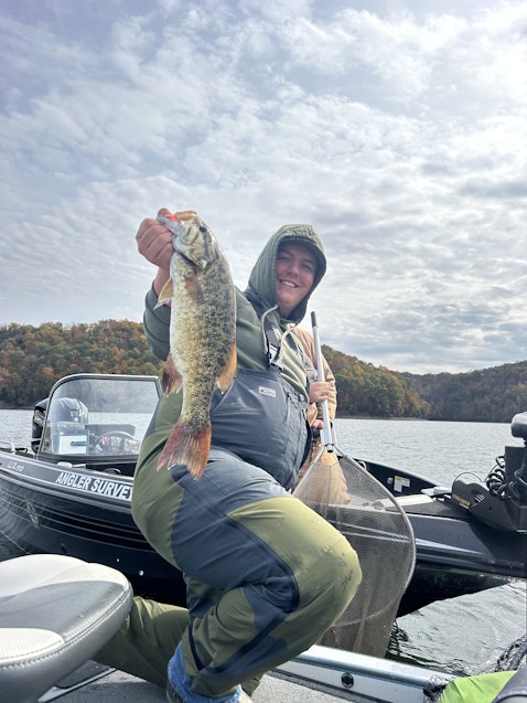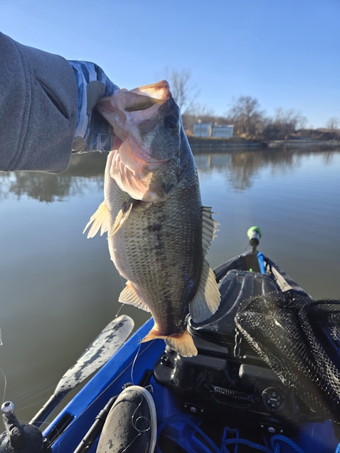 Clear skies with minimal wind. Water visibility was around 2'. I started the day dragging a 1/2 jig on the rip rap but had a few fish pick it up but not get the hook. I down sized to the 3/8 War Eagle finesse jig and was able to connect with a handful of smaller bass. It all started with this 5lber. The bites were light and they would start swimming to deeper water.