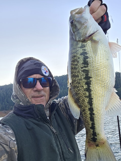 Kind of a broken record here....I really did try a lot of different techniques...but the cooler water and cold weather has really slowed these guys down. They were gorging if you could find them...but wouldn't hit any kind of reaction bait. So I would cruise from point to point until I found a school of kokanee....then post up and drop a trusty Senko down to the bottom, twitch around a little bit and bang! I would get into one. They seemed to be at 35-40 deep right on the bottom. They absolutely love the Sexy Shad Senko!!!! You can see from my pic...it was a little cold out here for Cali...