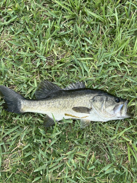 Saw a blow up out of the corner of my eye, followed by a little wake headed towards the bank and into thick grass. Casted directly along the bank just a bit farther than where i saw the blow up. Twitching the rattlin jig on the retrieve. nice and slow. First cast of the evening. He struck it in the middle of a few twitches. This little guy hit HARD so the rattle must have made him mad!