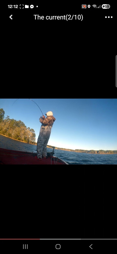 Calm day. Fish were not aggressive. Had to pick the area apart for this one. The Strike King Rattlin Pro Model by Denny Braurer, is one of the best Jigs to work in cover even with murky water. Something about that rattle draws them in after a few twitches. If they are not striking, its because there's no fish. Highly suggest picking one up if you have never used one. Just make sure to down size your trailer to compensate for the rattle.