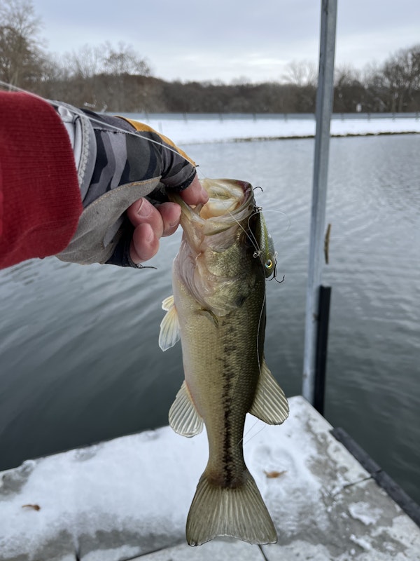 Largemouth BassTechniqueLipless CrankbaitsSeasonWinterStructureHumpsAir Temp 29 degrees, Water +/- 40…. Caught 1 1/4# in 4 ft water…. Used Kistler Chromium 7’ Med Rod, Kistler Series 2 Shallow Spool Reel 7.3:1 ratio, 12# 100% Trilene Flourocarbon
