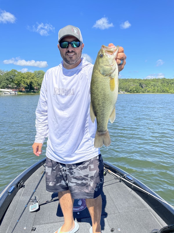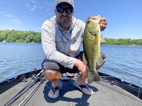 Largemouth BassTechniqueDrop ShotSeasonSummerStructureRock PileFish were very finicky but we found a few including a 4.8 pounder. All the fish we caught were on deep rocks in 10 to 13 feet of water.