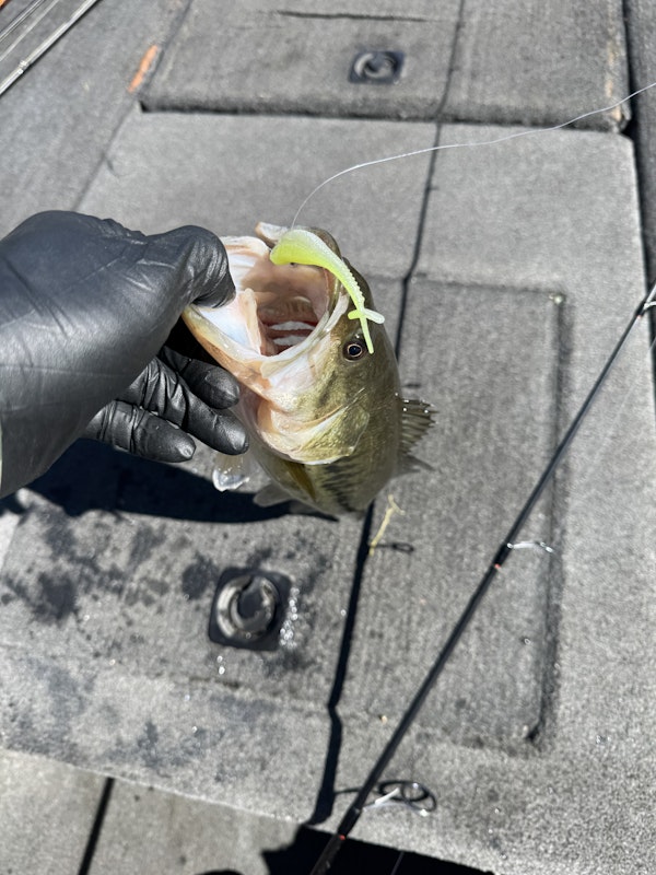 Largemouth BassTechniqueSoft Body Swimbaits (Small/Medium)SeasonSpring (Pre-Spawn)StructureSubmerged VegetationDelta is finally warming up! The underspin chartreuse was the bait of choice. Water clarity is about 12”. The new mastiff fluorocarbon worked beautifully.