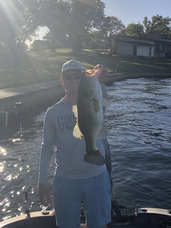 Largemouth BassTechniqueTexas Rigs (Pitch/Flip)SeasonSpring (Pre-Spawn)StructureDocksI went out to the lake on 03/27/22 to practice for two upcoming tournaments I have next weekend. It was sunny all day with lows in the lower 50's and highs in the mid 80's, a steady southwest wind that picked up later in the day, and water temperatures between 55 and 64 degrees. The water clarity was between about 6 inches of visibility to a foot of visibility across the lake. I spent the morning looking deeper trying to find fish on points or in brush or rock piles, but did not have much success, so I then transitioned to fishing shallow and targeting docks along rockier banks as well as rocky seawalls in 2-6 feet of water with a texas rig. I focused mainly on main lake stretches or stretches just inside the mouths of creeks as I could not seem to get bit in the backs of pockets. The water in the lake was about a foot and a half low, so I think that may be why some of the fish haven't pushed all the way back yet even though the water temperature and conditions are starting to get right for them to start moving back. I was able to catch 4 fish throughout the day, and my tournament partner was able to put 3 in the boat as well. In total, we probably had between 10 and 12 bites, and our best 5 would've probably been around 16 or 17 pounds, all on the Texas rig. Fishing stretches that had the wind on them seemed to be key later in the day as well. Below is a photo of one of the better fish we boated that day! Thank you all for reading my reports, and tight lines!
