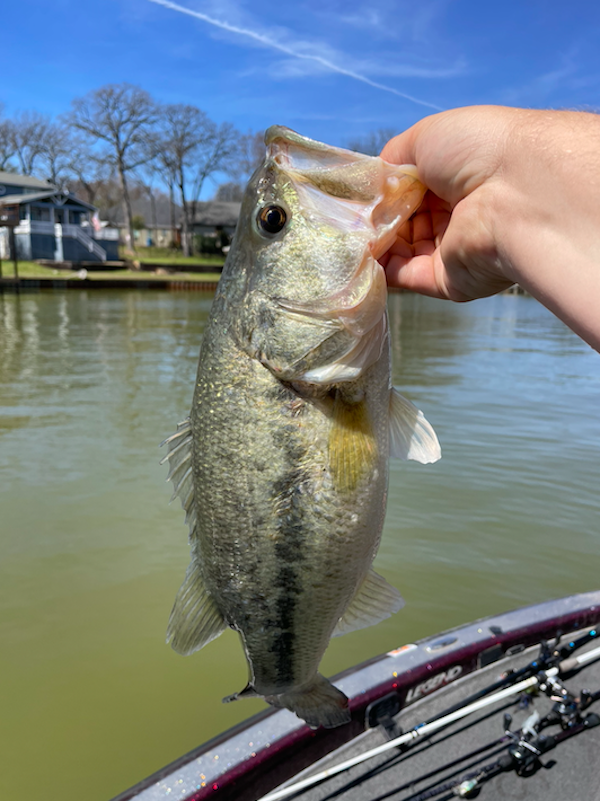 Largemouth BassTechniqueShallow Diving Crankbaits (0-6')SeasonSpring (Pre-Spawn)StructurePointsI fished the lake on 04/03/22 for the 2nd Bass Champs TX North Region Event. It was a sunny day with morning temperatures in the mid 50's and warming up into the mid 80's by the end of the day. There was a strong southwest wind and the water clarity on the lake ranged from a few inches to a foot of visibility depending on if you were on a windy bank or not. The water temperatures ranged from 61 to 70 degrees throughout the lake, and the fish were on the move up to their spawning areas. We started the day targeting a rock point with a tire reef at the mouth of a spawning cove in 3-5 feet of water with squarebill crankbaits, and then later transitioned to fishing a few docks. We then ended the day in the back of a spawning cove and were able to utilize livescope perspective mode to pick up a key fish off of a bed in muddy water at the end of the day with a texas rig. It was a great day on the lake as we weighed in 21.65 pounds in the tournament which was good enough for 5th place out of the 208 teams competing and a decent check. The lake is on fire right now and the big females are starting to move up, so if you get the chance to go out on the lake you should definitely take it. Good luck everyone and thanks again for reading my report!