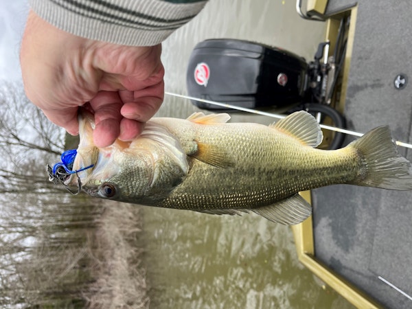 Largemouth BassTechniqueBladed JigsSeasonSpring (Pre-Spawn)StructureFlooded BrushAll bites in heavily stained shallow water (less than three feet) in Shouse Ford area.