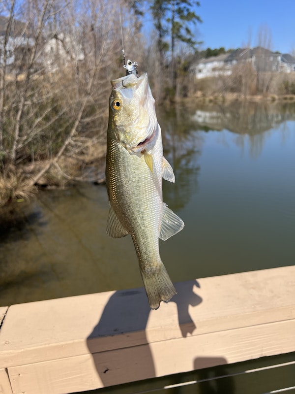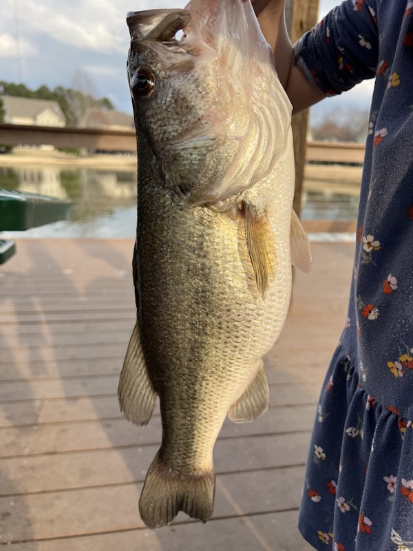 Largemouth BassTechniqueLive Bait RigsSeasonSpring (Pre-Spawn)StructureDocksTook my daughter out fishing on a little spillway pond off of Falls Lake. She caught several good sized bluegill, so we decided to throw one on a circle hook and drop it straight down under the dock. These fish have been known to not hit artificial lures, but they'll eat hotdogs, live bait, and catfish bait. After about 5 minutes of waiting, the line started screaming off the reel and the rod was bent over in half. We pulled in this beautiful 3.5 pound largemouth.