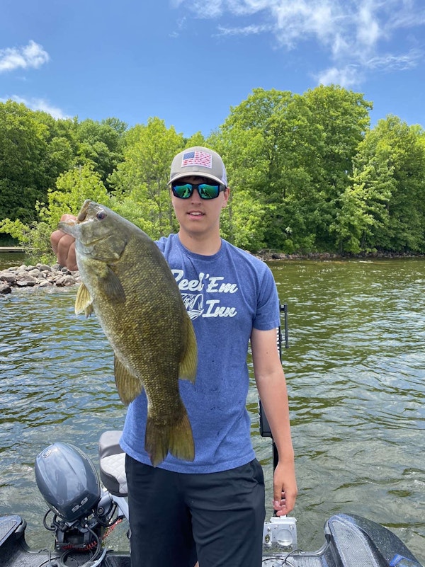 Smallmouth BassTechniqueFootball JigsSeasonSummerStructureRock PileSmallmouth could be caught in offshore reefs, shallow rock points, and sand banks along the shore. A 1/2oz football jig was the best producer with a craw trailer. Fish also bit on 3" spark shads slow rolled over rocks, a dropshot with a Meagabass Hazedong shad, and a ned rig. Fish liked eating off the bottom with something worked slowly.