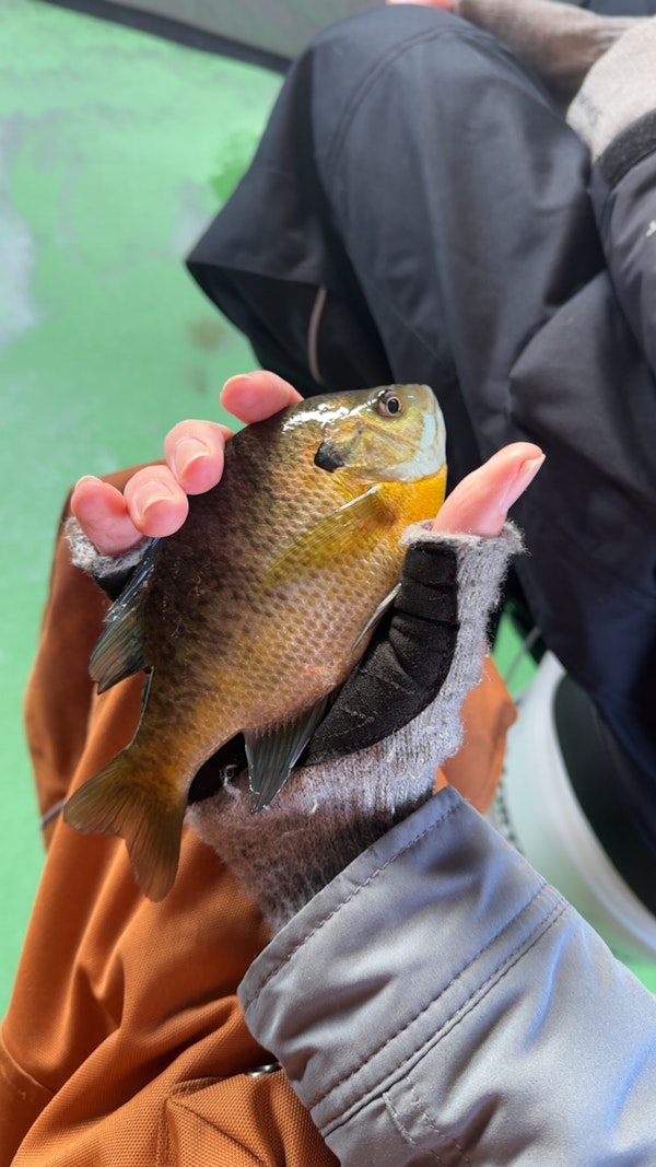 Panfish / BluegillTechniqueIce Fishing JigsSeasonIceStructureBaitfishThey want the smallest jig possible, near bottom. Better to be near the center of the lake instead of edges for panfish. Not much size to these guys. Biggest of the day, was released for another day
