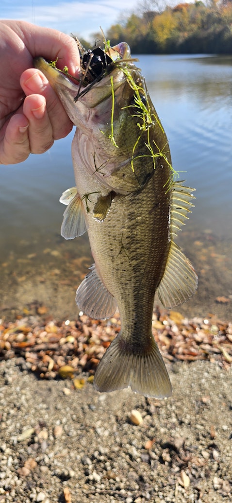 I was fishing off a dock in the fall blue skies and calm water. Next to the dock, they had sunk some Christmas trees for structure, and I started ripping a red eye shad lipless around them, and then this guy hit it and gave up a good little fight.