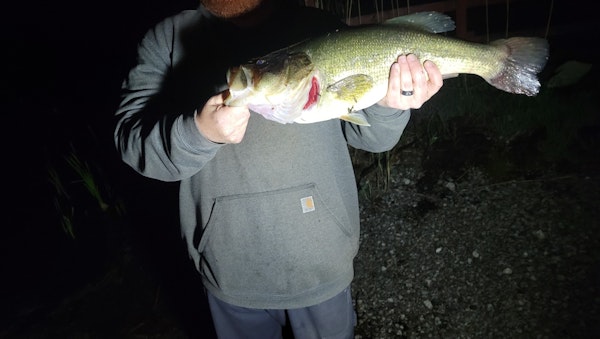 Largemouth BassTechniqueDrop ShotSeasonSpring (Pre-Spawn)StructureReedsIt was a cool, calm night fishing a boat launch that had a reed edge and a deep drop off. I was drop shotting a zoom finesse worm in junebug along the Reed edges. When I night fish, I find drop shot works well if you kind of slowly work it back instead of popping it. I cast it out along the edges again and worked it down the drop off, and then I thought I got snagged, but it turned out it was a 6 lb bass, and the fight was on.