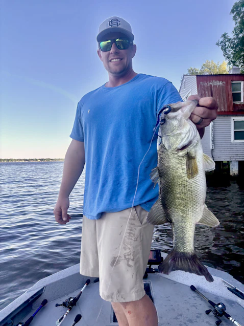 We focused on bluegill spawning areas. The moon was full. We found fish staging on Cyprus trees and stumps. Texas rigging a fighting frog got bit throughout the whole day. Also caught fish on the outside part of docks with a drop shot.