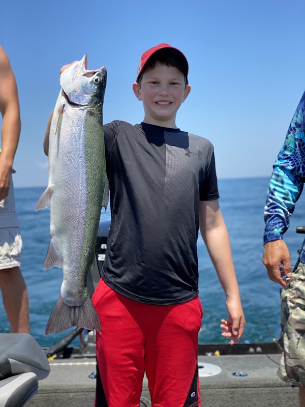 TroutTechniqueTrolling Deep (20'+)SeasonSummerStructureBaitfishHad my son Wyatt out on this day Trolling deep for summertime Steelhead in the central basin of Lake Erie targeting fish just above the thermocline with Downriggers and also using Dipsy Divers.that day with spoons. This fish came off a Downriggers set up.