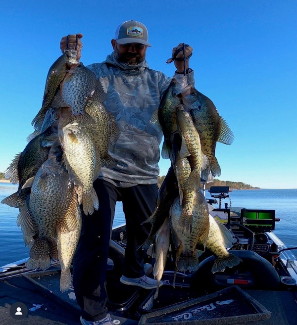 CrappieTechniqueVertical Jigging Deep (20'+)SeasonWinterStructureOpen Water/BasinWorld famous for its bass fishing, it is a top ten crappie lake as well! I fished Lake of the Pines the day prior and drove over to Lake Fork. I prefer Pines over Fork in the dead of winter only because the crappie relate to structure better at Pines. The crappie at Lake Fork where in the middle of the main creek channel right under the bait (shad), open water not relating to any cover/structure. The crappie where 25’ down over 35’ – 40’ of water and schooled up big time, like they should be in winter. Only issue was trying to keep up with the school as they moved. Easily done with Live scope, without might have been impossible. Downsizing was the key on Lake Fork. I was using a 1/32oz hair jig with a bobber stopper above the hair jig to get it down to the fish in a hurry but still have a small compact jig to present to the crappie, this technique has been deadly since forward facing sonar has come out. I ended the day with a limit of black and white crappie both, all over 1.8 lbs. Few lakes in the country where you can do this.