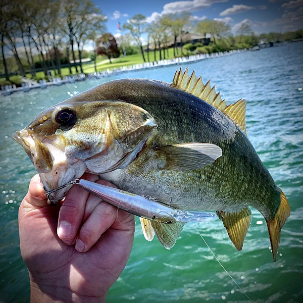 Smallmouth BassTechniqueHard JerkbaitsSeasonSpring (Pre-Spawn)StructureDocksLong pauses between 3 short jerks