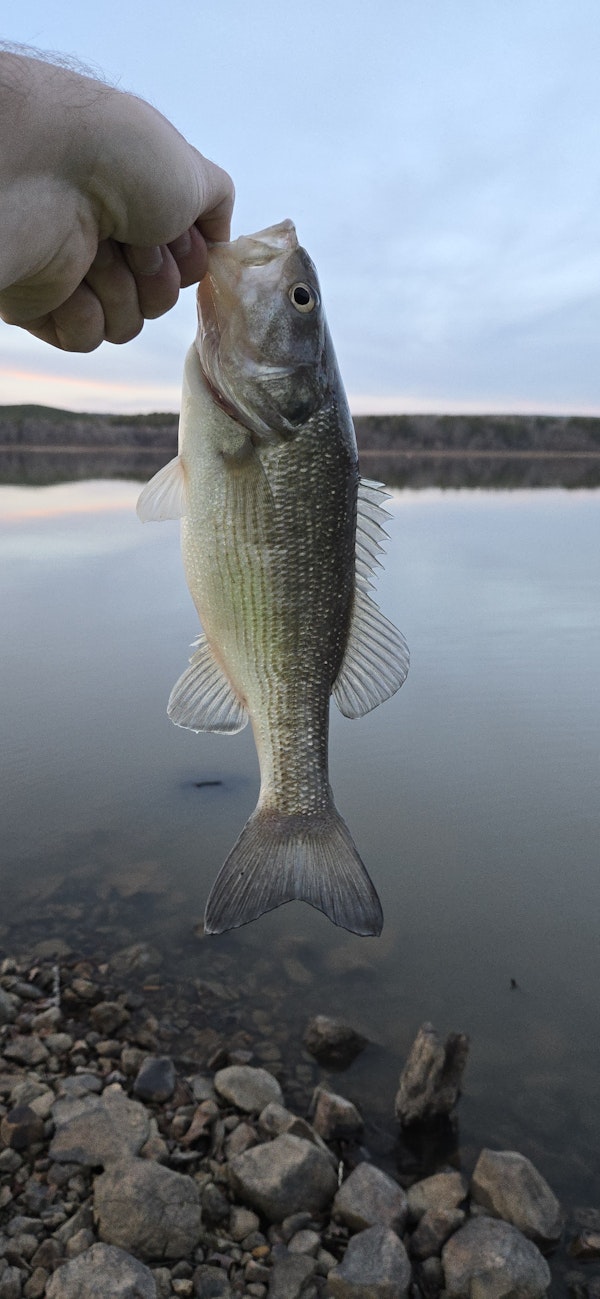 Spotted BassTechniqueTexas Rigs (Pitch/Flip)SeasonWinterStructureRock PileI'm thinking this is a spotted bass because of the dorsal fin. Caught two on this trip. Both just slowly dragging across the rocky bottom