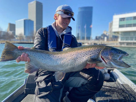 Sweeping jig in bottom half of water column, brown trout in the Milwaukee area.