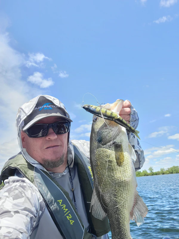 Largemouth BassTechniqueHard Body SwimbaitsSeasonSpring (Post-Spawn)StructureSubmerged VegetationThrowing a GanCraft Jointed Claw 178 on the 4 to 10 foot flats with emerging cabbage produced 13 bites, 11 fish landed. Best 5 Largemouth were 21.26lbs.