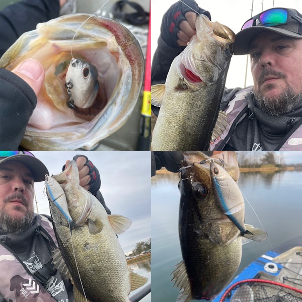 Largemouth BassTechniqueSoft Body Swimbaits (Large)SeasonSpring (Pre-Spawn)StructureSubmerged VegetationCaught 3 early on a 6” glide bait (all were 3.5 -4.5 lbs). Also caught a few on the bladed jig through the day. Fished the edges of submerged hydrilla.