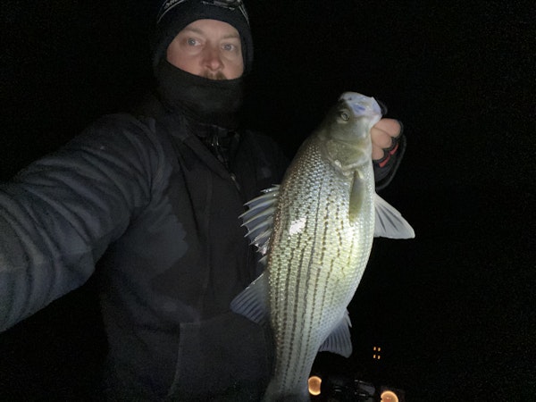 Striped BassTechniqueFinesse JigsSeasonWinterStructureDocksFishing after dark on any main lake docks with underwater or over hanging lights can hold schools of hybrids and striped bass.