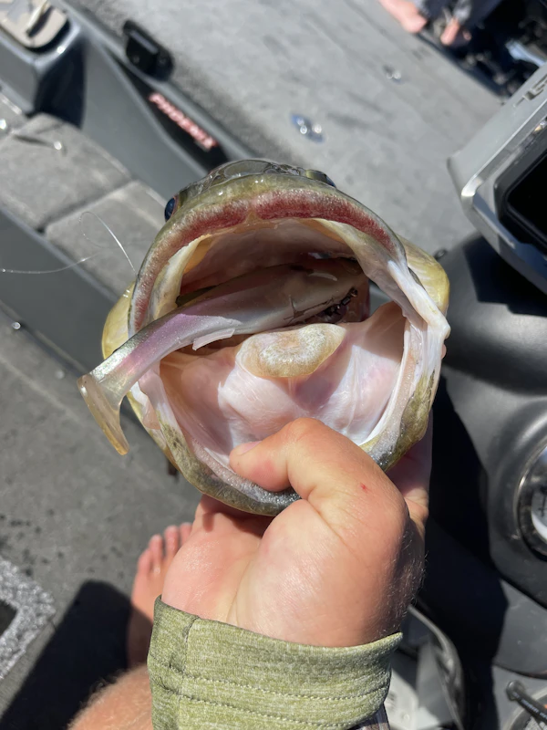 Largemouth BassTechniqueSoft Body Swimbaits (Large)SeasonSpring (Spawn)StructureRock PileFish were just starting to spawn and the rest of them were getting ready to spawn. Caught this 5 pound largemouth in a short pocket off the main river. Big chunk rock seemed to be the key for the largemouth.