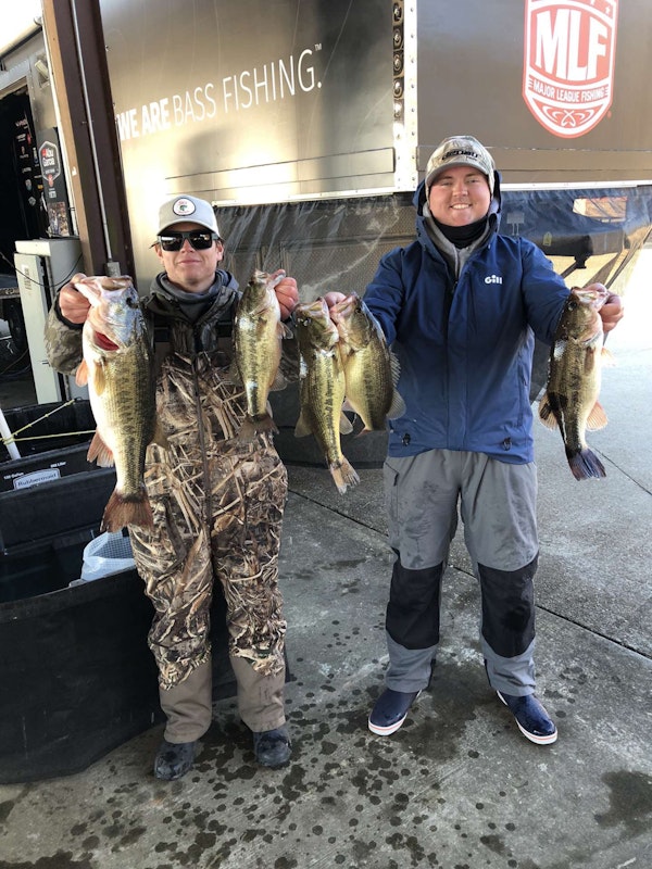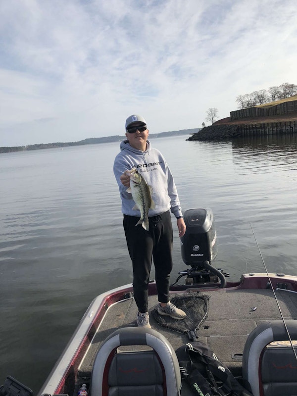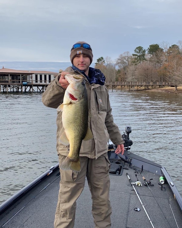 Largemouth BassTechniqueFinesse JigsSeasonSpring (Pre-Spawn)StructureDocksThis report is from my trip out to the lake on 01/19/22 when I went out for my final day of practice before the MLF Collegiate Southern Conference event on the lake on the 21st. It was sunny this day with not much cloud cover and and a slight breeze, as outside air temperatures were about 45 in the morning hours and rose to about 70 degrees at its highest point. The water temperatures on the lake this day ranged from 53 - 57 degrees, and the water had about 12 - 18 inches of visibility. We started the day dragging jigs on a roadbed at the mouth of a spawning flat in 6-14 feet of water and caught some nice fish. After that, we made our way down to a stretch of docks on a steep bank with the main river channel swinging up underneath the front of the docks. The docks were in about 3-15 feet of water, but the channel swinging up next to them got as deep as 50 feet, and when we idled over it we could see pods of baitfish in the deepwater, so we knew bass would be close by. We fished down the docks flipping finesse jigs along the deeper posts at the faces of the docks, and were able to catch a 5 fish limit weighing somewhere around 12 or 13 pounds. After that, we pulled up on a shellbed in about 3-9 feet of water and picked up 1 bass weighing around 5 pounds on a chatterbait. It was a great last practice day for our first tournament of the year and we had a blast! I have attached a photo of one of the dock bass we caught that day, the size of that fish was about the average size we were catching. Thank you all for reading and good luck out there!