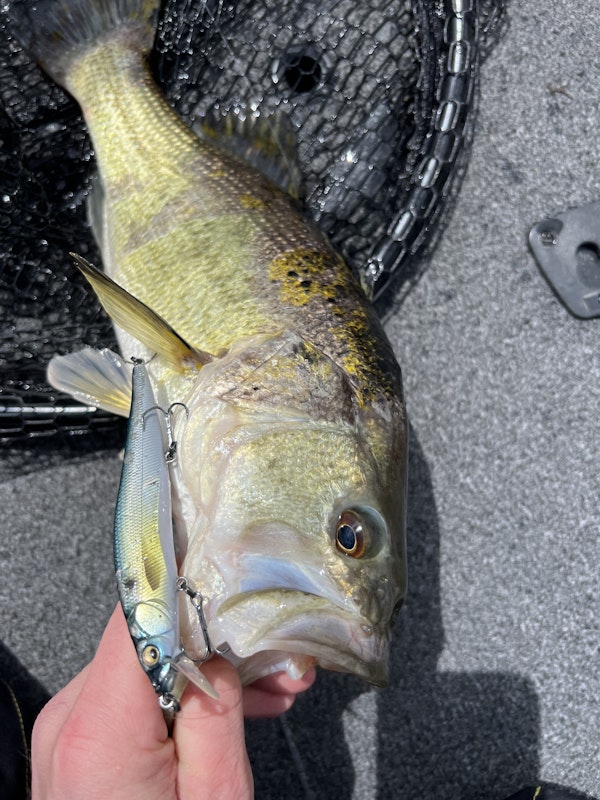 Largemouth BassTechniqueHard JerkbaitsSeasonSpring (Pre-Spawn)StructureLaydownsBites were tough to come by today. We had 6 bites including this odd colored largie. Not a clear pattern today but they really hit the megabass hard when then hit.