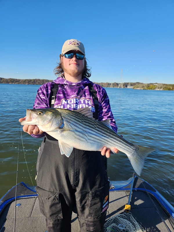 Striped BassTechniqueUmbrella RigsSeasonWinterStructureDamFishing main current drifts below wheeler dam. Focus on the largest current changes. Try swapping to a dark colored swimbait on just the middle wire to get a reaction bite.